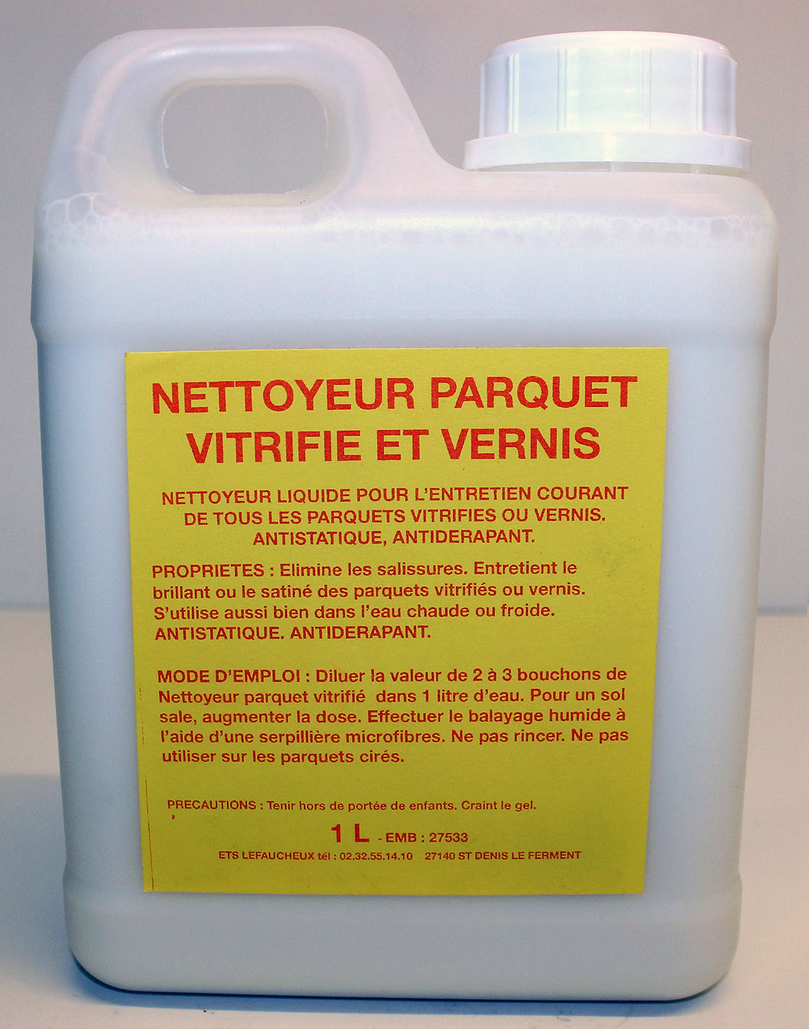 Le Nettoyeur parquet vitrifié est nettoyeur liquide pour l'entretien courant de tous les parquets vitrifiés ou vernis. Ne pas utiliser sur les parquets cirés. Il élimine les salissures, entretient le brillant ou le satiné des parquets.